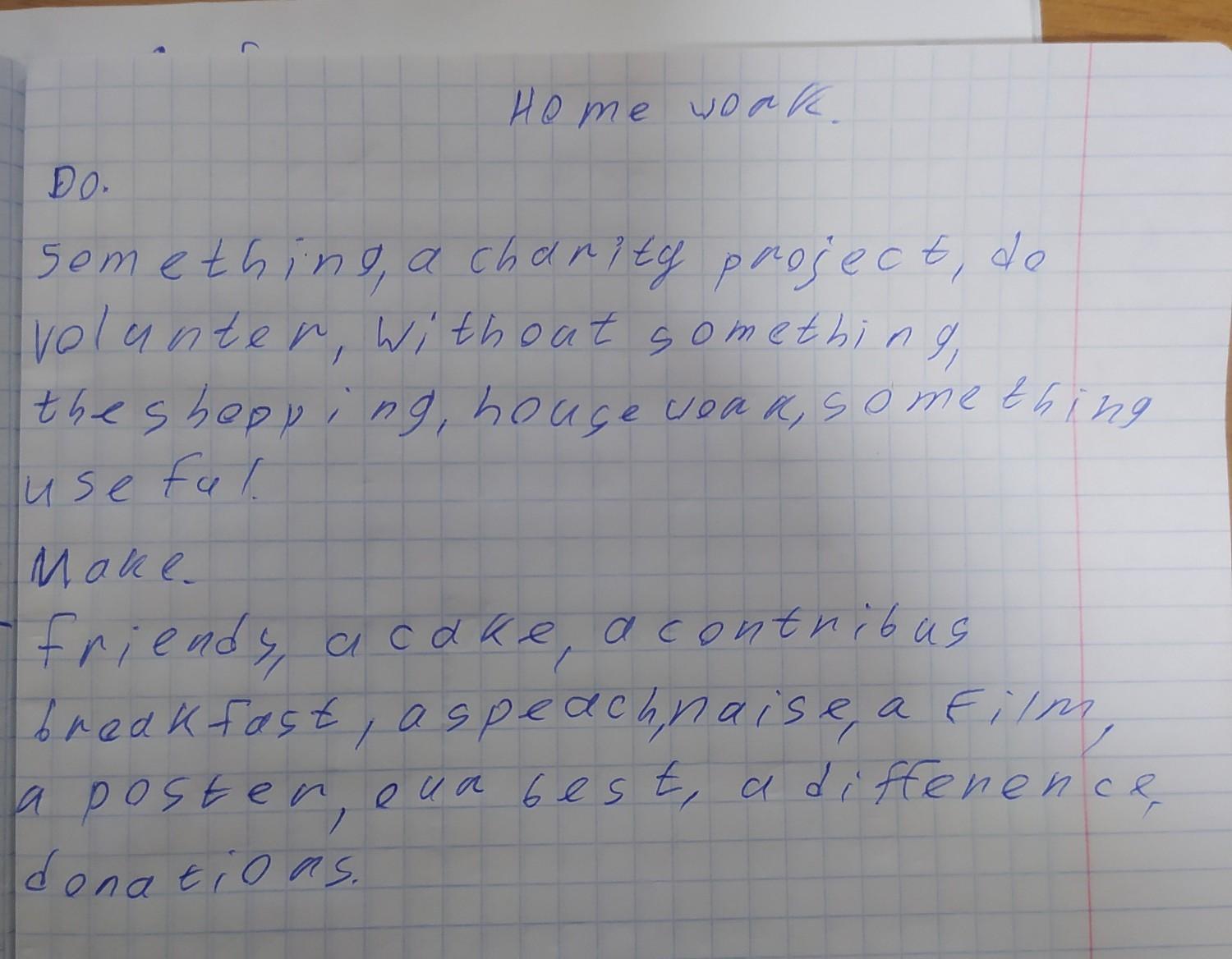 Ответ:did you do something? People should do charity projects. We were doing voluenteer. I do this without gloves. My sister was doing shopping. Mum is doing house work. Has he ever did something useful? I made a lot of friends during my holiday. My mum also made a cake. My dad did a contribus breakfast.