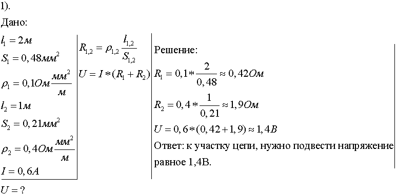 Участок цепи состоит из стальной проволоки длинной 2м и площадью поперечного сечения 0,48 мм 2,соединенной последовательно с никелиновой проволокой длинной 1м и площадью поперечного сечения 0,21 мм 2 .Какое напряжение надо подвести к участку.чтобы получить силу тока 0,6 А.