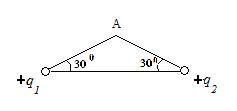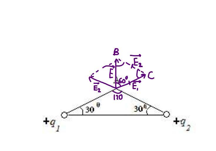 Тупой угол в точке A равен 180 - 30 - 30 = 120, угол между вектором напряжённости от заряда q и результирующим вектором равен 120°/2 = 60° (нижний треугольник – равнобедренный, заряды равны, тогда равны и длины векторов напряжённости их полей, и мы можем делить на 2, чтобы найти угол).