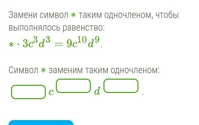 Замени символ ∗ таким одночленом, чтобы выполнялось равенство: ∗⋅3c3d3=9c10d9. Символ ∗ заменим таким одночленом: cd.