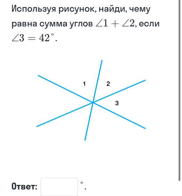 в сумме эти три угла дают 180 градусов.Так как угол 3 42 градуса то 180-42=138 градусов 1 и 2 углы. удачи ☆☆☆☆