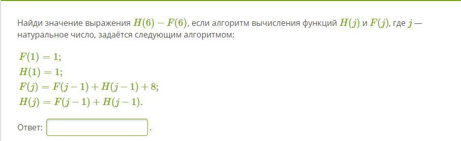 Найди значение выражения H(6)−F(6), если алгоритм вычисления функций H(j) и F(j), где j — натуральное число, задаётся следующим алгоритмом. С объяснением, если можно)