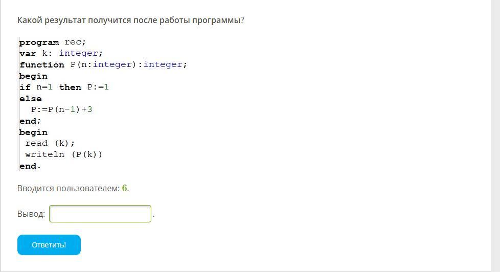 С клавиатуры вводится число 6, это переменная K. Выводится результат функции P.