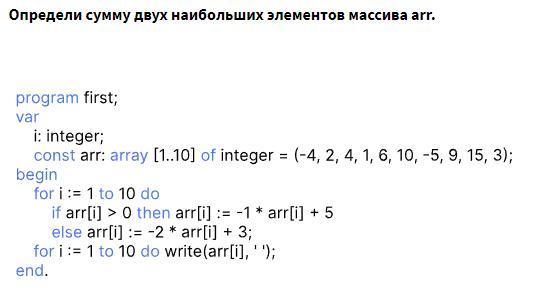 arr: array[1..10] of integer = (-4, 2, 4, 1, 6, 10, -5, 9, 15, 3);
