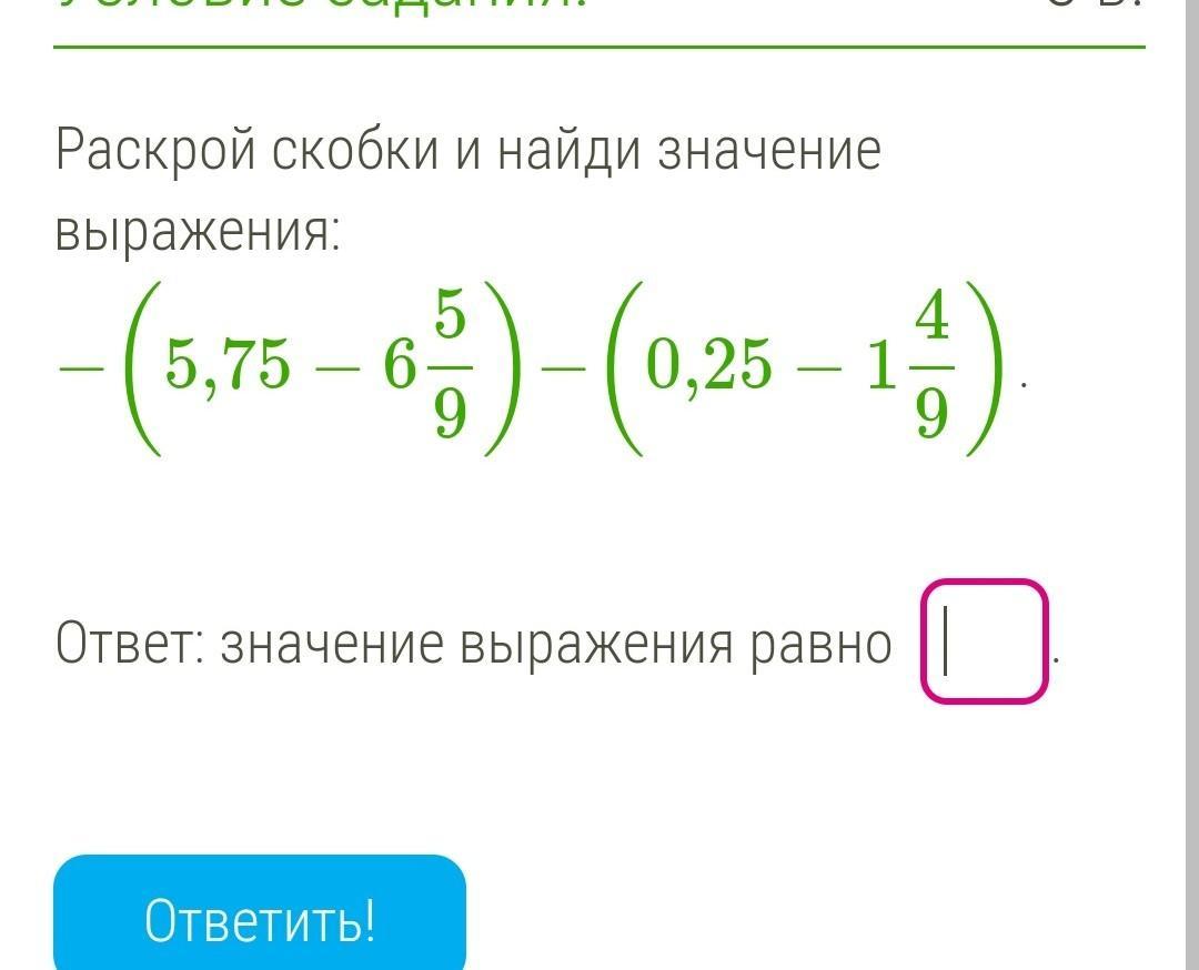 -(5,75-6 5\9)-(0,25-1 4\9)=-5,75+6 5\9 - 0,25+1 4\9=(-5,75-0,25)+((6+1)+(5\9+4\9))=-6+(7+1)=-6+8=2