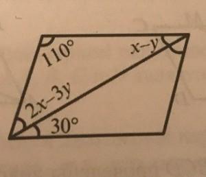х-у=30°- т.к. эти углы внутренние накрест лежащие при параллельных прямых, на которых лежат горизонтальные стороны параллелограмма и секущей - прямой, на которой лежит изображенная диагональ. из второго уравнения х=у+30, подставим в первое уравнение, получим