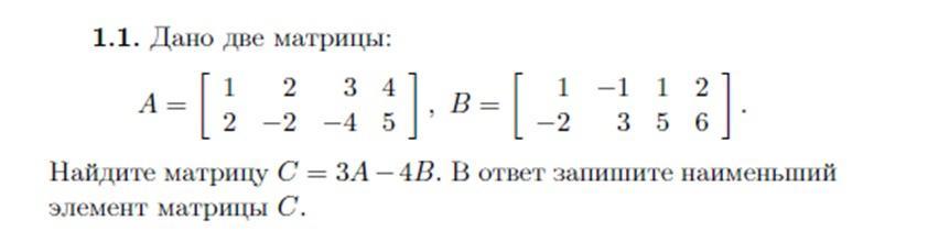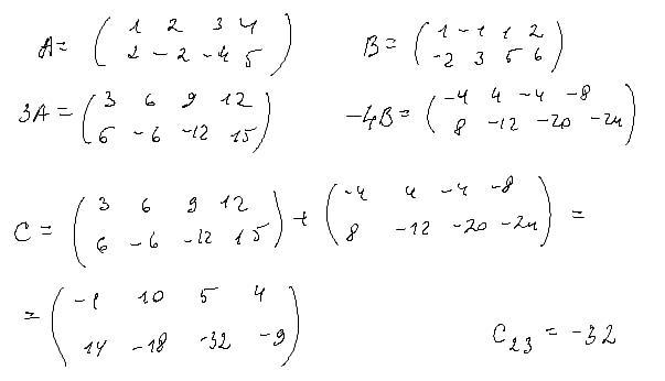 первое: каждый элемент А умножаете на 3, каждый элемент В умножаете на (-4), потом добавляете соответствующие элементы матриц