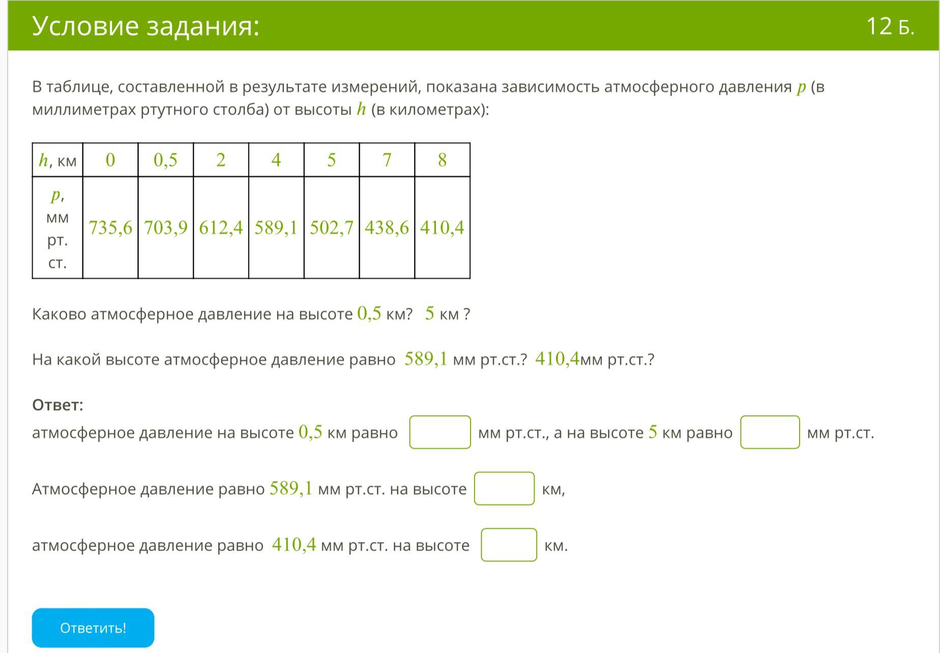 В таблице, составленной в результате измерений, показана зависимость атмосферного давления (в миллиметрах ртутного столба) от высоты ℎ (в километрах):