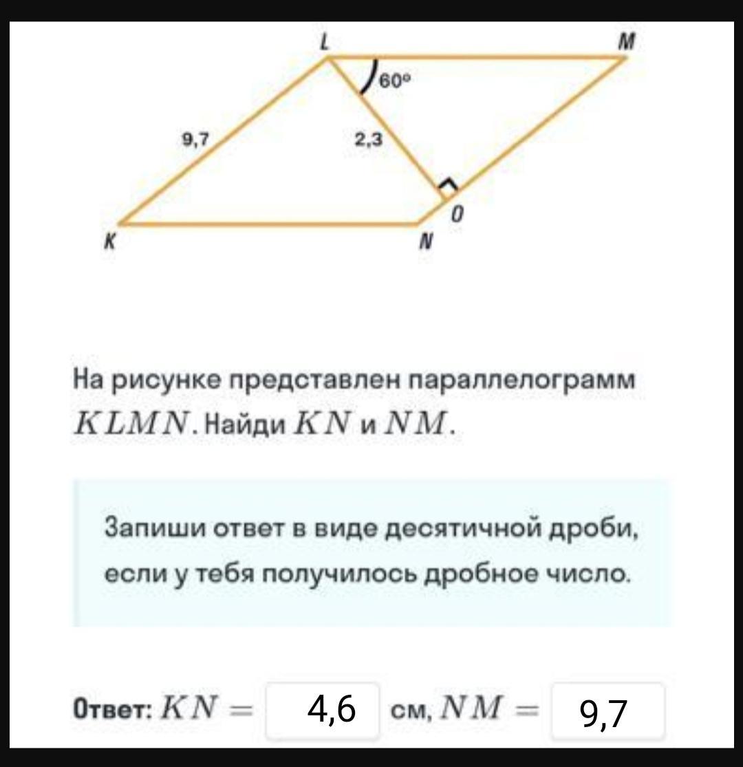 треугольник LOM - прямоугольный (∠ О=90°): ∠L=60, ∠М=90°-60°=30° . Катет, который лежит против угла 30°, равен половины гипотенузы. Тогда LM=2OL=2*2,3=4,6=KN как противоположные стороны параллелограмма