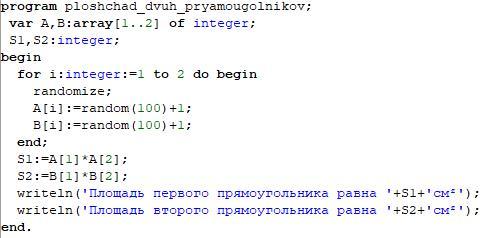 2.2.4. Даны два прямоугольника. Значения сторон вводятся через массив случай ным образом.На пишите програм му вычисляющую площадь каждого прямоугольника, и вывести на экран их значение.