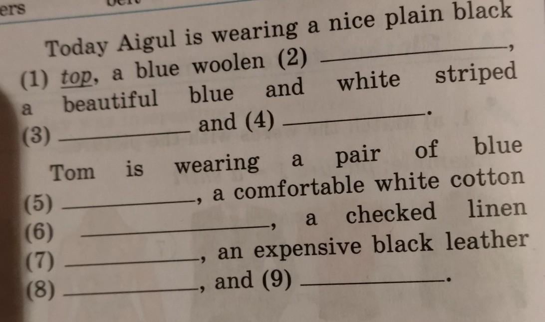 Today Aigul is wearing a nice plain black (1) top, a blue woolen (2) beautiful blue and white striped (3) and (4) Tom is wearing a pair of (5) a comfortable white cotton (6) a checked linen ) (7) an expensive black leather (8) and (9) помогите пожалуйста