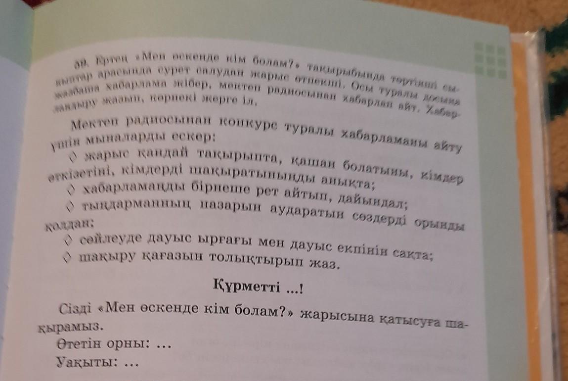 59. Ертең «Мен өскенде кім болам?» тақырыбында төртінші сы- Жазбаша хабарлама жібер, мектеп радиосынан хабарлап айт. Хабар- дандыру жазып, көрнекі жерге іл. Мектеп радиосынан конкурс туралы хабарламаны айту шін мыналарды ескер: жарыс қандай тақырыпта, қашан болатыны, кімдер Ткізетіні, кімдерді шақыратыныңды анықта; У хабарламаңды бірнеше рет айтып, дайындал; тыңдарманның назарын аударатын сөздерді орынды сөйлеуде дауыс ырғағы мен дауыс екпінін сақта; лдан; ошақыру қағазын толықтырып жаз. Құрметті ...! Сізді «Мен өскенде кім болам?» жарысына қатысуға шақырамыз. өтетін орны: ... Уақыты: ...
