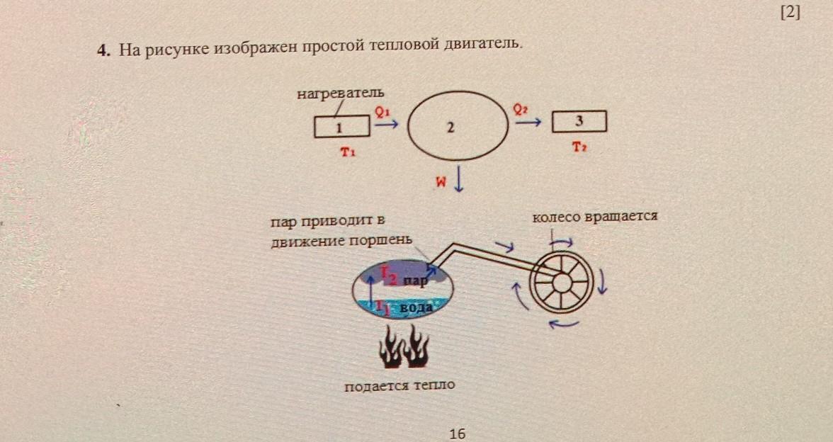 4. На рисунке изображен простой тепловой двигатель. нагреватель Т1 2 3 W T₂ пар приводит в движение поршень пар колесо вращается 11- вода подается тепло ПОМОГИ ПОЖАЛУЙСТА