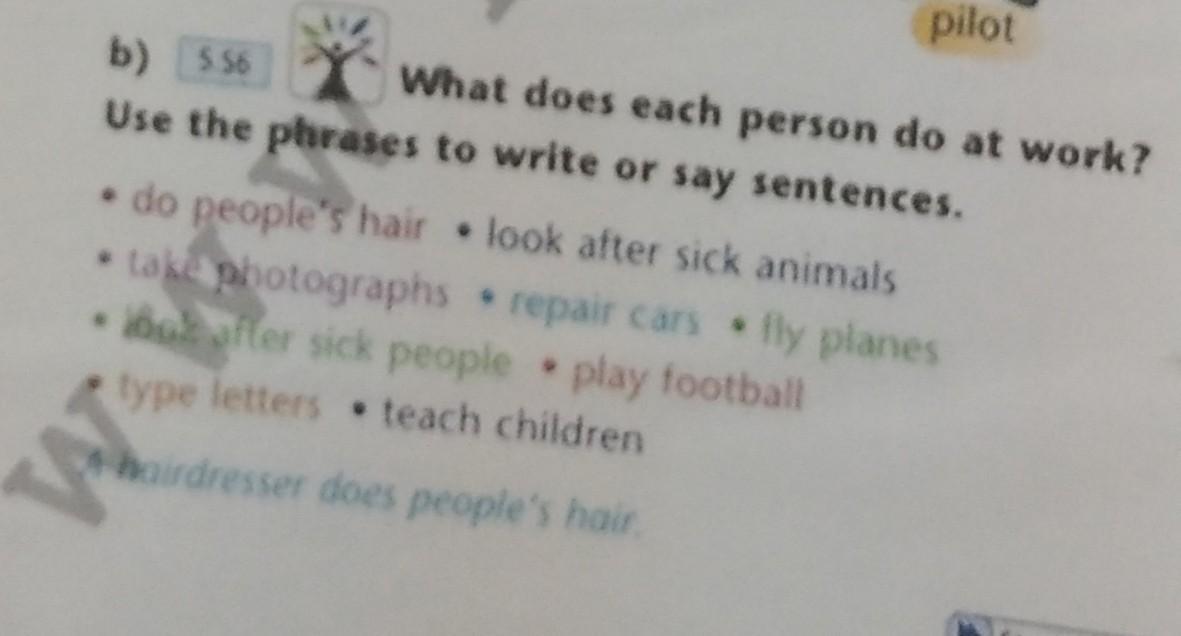 A vet looks after sick animals. A photograph takes photographs. A mechanic repairs cars. A pilot flys planes. A nurse look after sick people. A footballer plays football. A teacher teaches children.