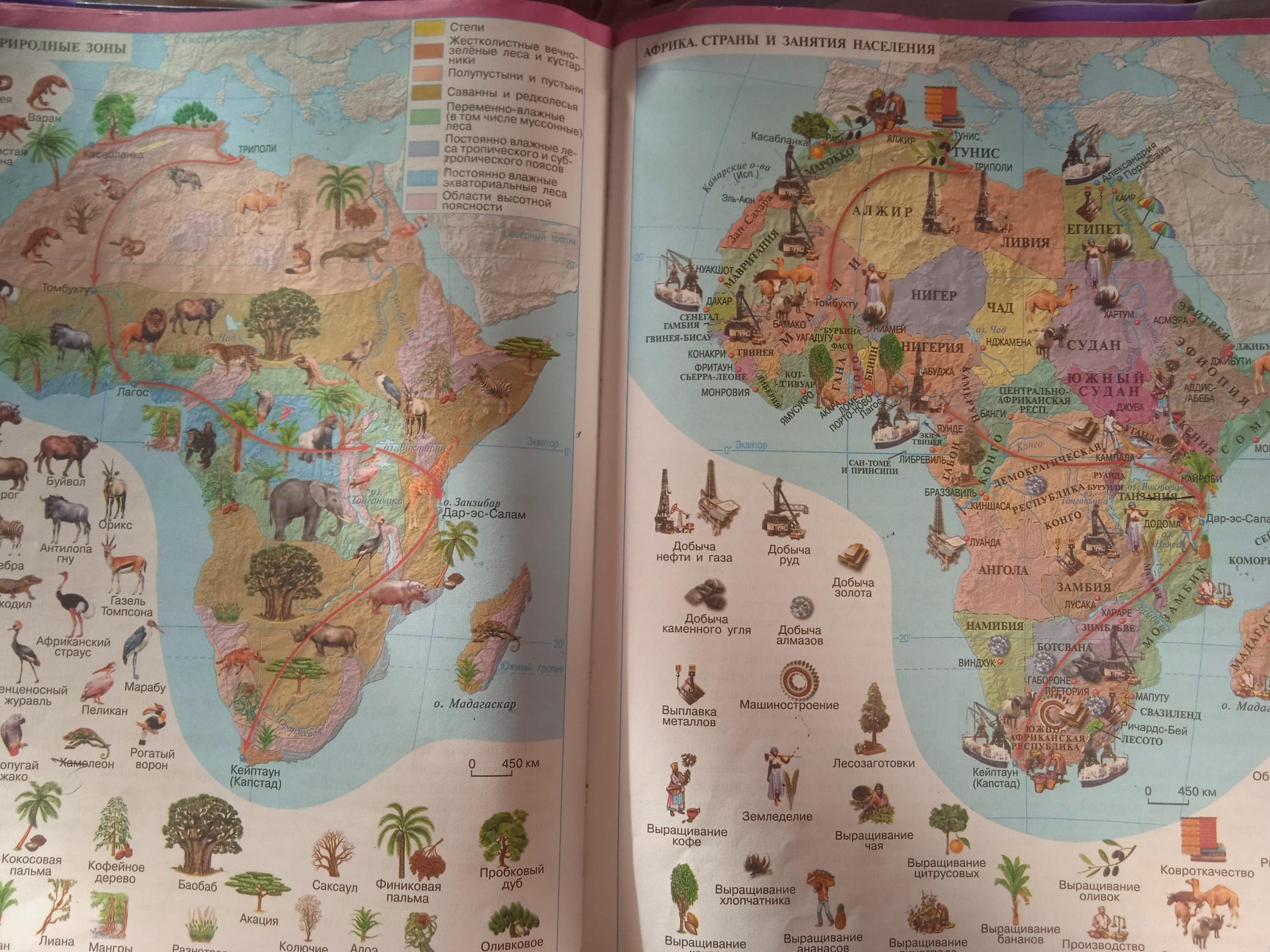 На с. 108-109 вы найдёте две географические карты, на которых проложен наш маршрут. Па первой карте показаны природные зоны Африки и основные представители их растительного и животного мира. На торой карте — страны и занятия населения. Можно также разглядеть и рельеф территории в общих чертах, но лучше дополнительно проверять себя но физической карте Африки (см. Приложение, с. 246).
