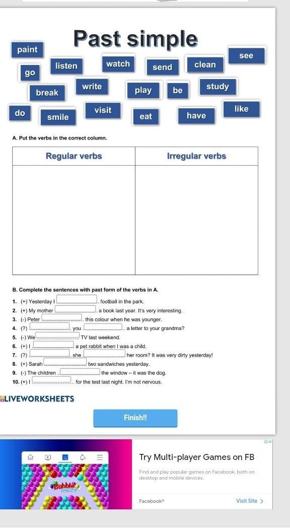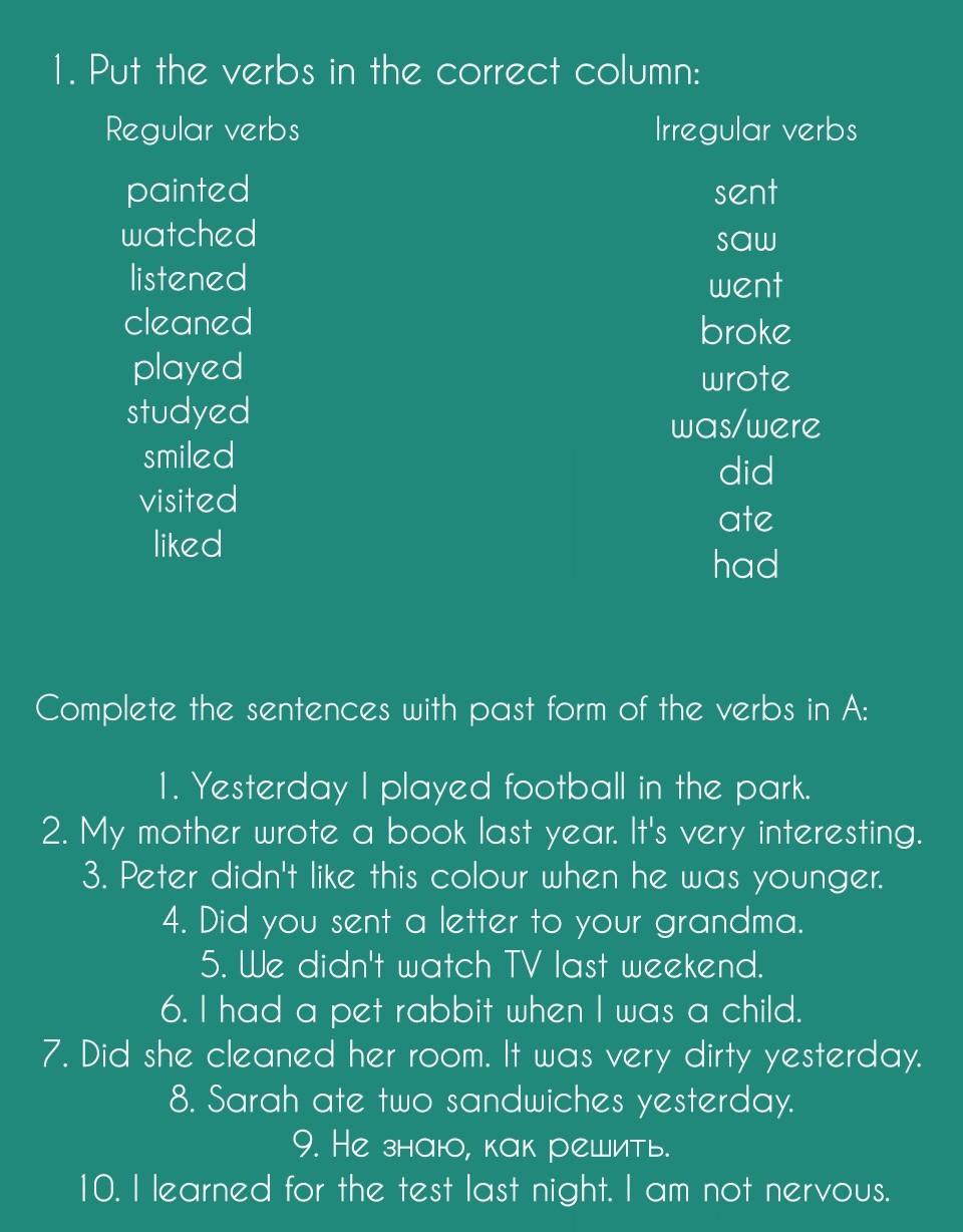 Regular verbs:painted,listened,watched,cleaned,played,studied,smiled,visited,liked Irregular:sent,saw,went,broke,wrote,was,were,did,at,had,