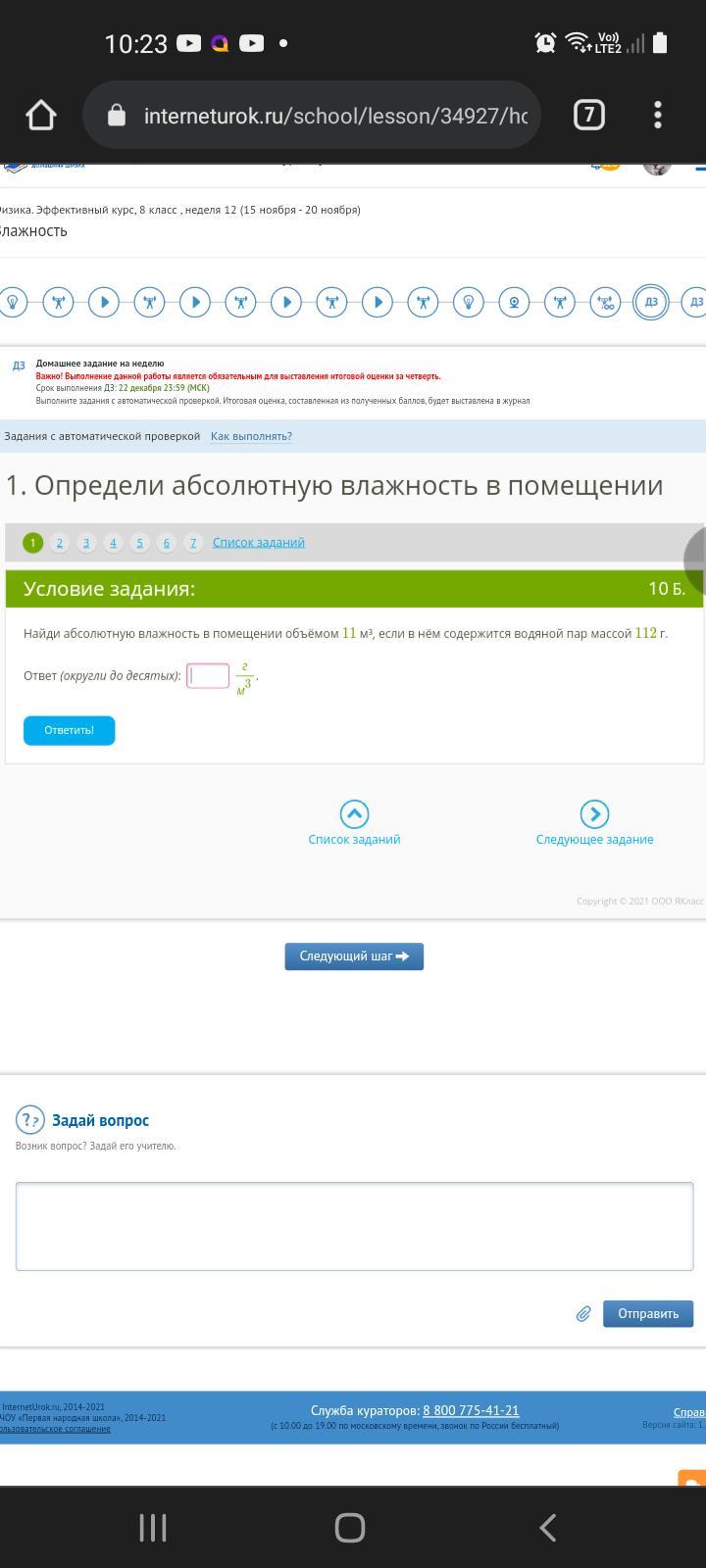 Найди абсолютную влажность в помещении объёмом 11 м³, если в нём содержится водяной пар массой 112 г. Ответ (округли до десятых): гм3.