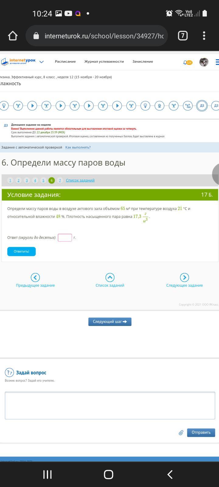 Определи массу паров воды в воздухе актового зала объёмом 65 м³ при температуре воздуха 21 °С и относительной влажности 48 %. Плотность насыщенного пара равна 17,3 гм3.