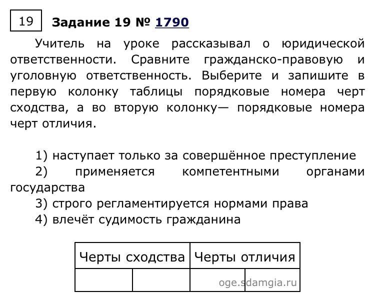 Учитель на уроке рассказывал о юридической ответственности. Сравните гражданско-правовую и уголовную ответственность. Выберите и запишите в первую колонку таблицы порядковые номера черт сходства, а во вторую колонку — порядковые номера черт отличия.