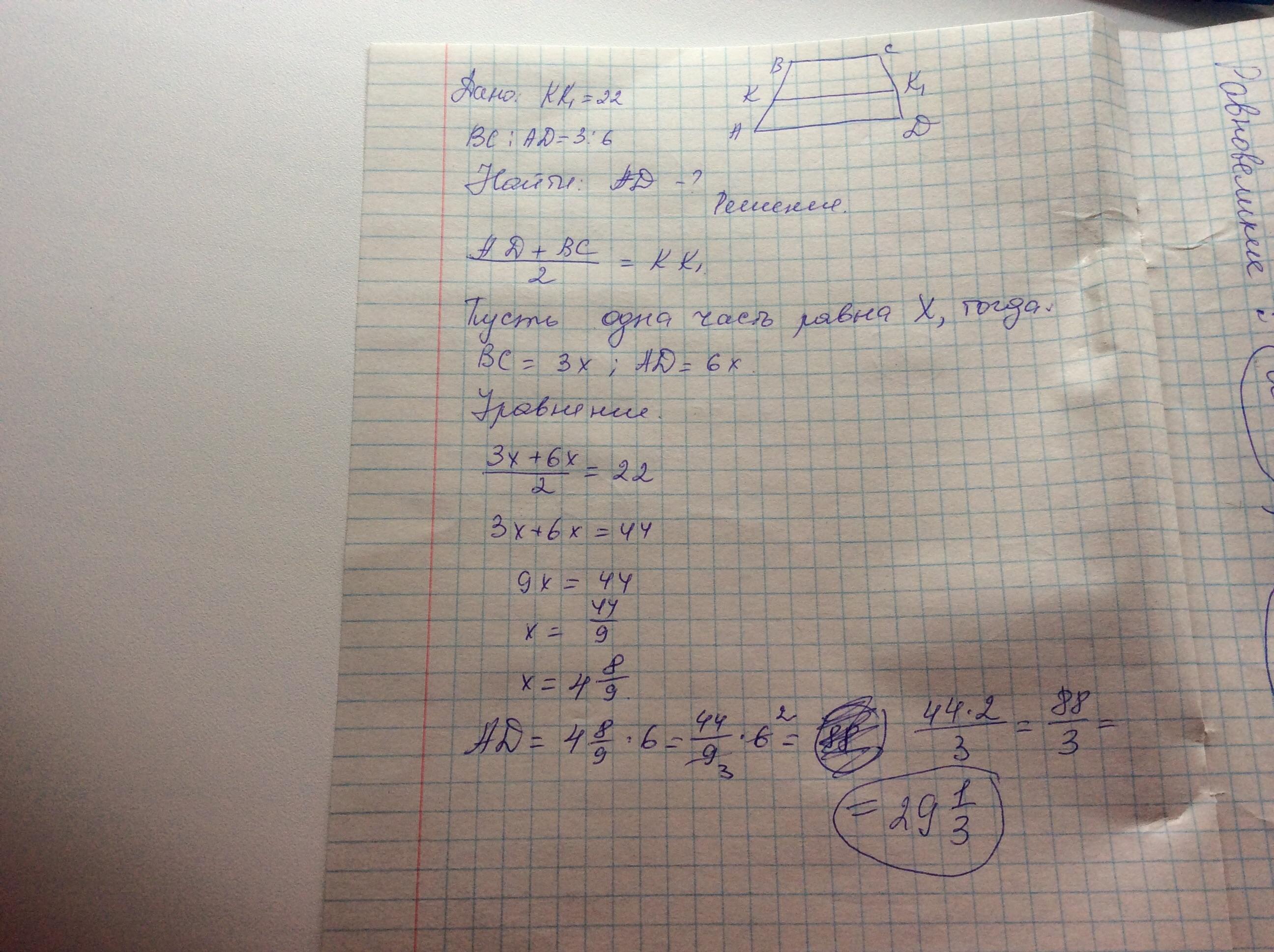 Средняя линия трапеции равна 22. Основания трапеции относятся как 3:6. Найти большее основание трапеции.