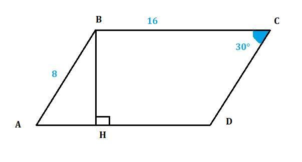 В параллелограмме ABCD проведена высота ВН. Известно, что C = 30 , BC = 16, AB = 8. Найди площадь параллелограмма.