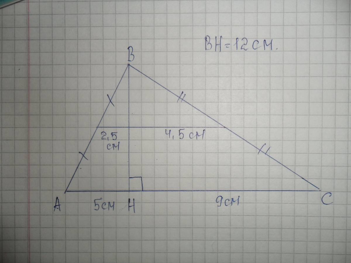 высота треугольника равна 12 см и делит среднюю линию, перпендикулярную ей, на отрезки 4,5 см и 2,5 см. Найдите периметр треугольника. Помогите Плииииииз!!