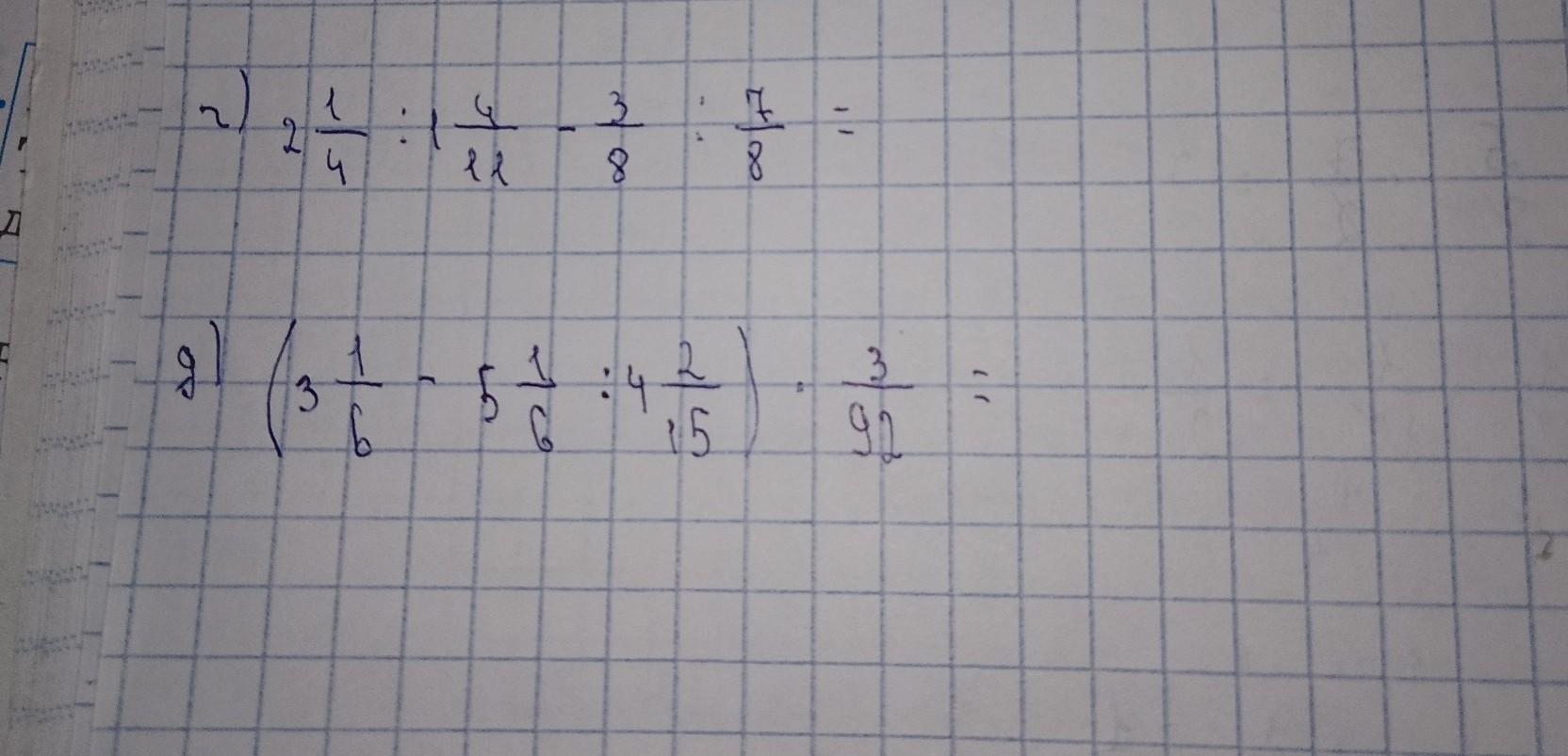 1) 2 1/4: 14/11% 3D 9/4: 15/11 3 9/4 * 11/15 - 33/20 2) 3/8: 7/8% 3D 3/8 * 8/7% 3 3/7 3) 33) 20- 3/7 3 231 / 140- 60/140% 3 171/140% 3 1 31/140 1 31/140 e) 1) 5 1/6: 4 2 / 15 3 31/6: 62/15% 3 31/6 * 15/62% 3D 5/4% 3D 11/4 2) 3 1/6 -11/4% 3D 3 2/12 -1 3/12% 3D111 / 12 3) 111/12 * 3/92% 3D23 / 12 * 3/92 3 1/16 Ответ: 1/16