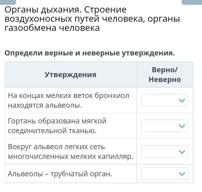 Органы дыхания. строение воздухоносных путей человека, органы газообмена человека определи верные и неверные утверждения. утверждения верно/ неверно на концах мелких веток бронхиол находятся альвеолы. гортань образована мягкой соединительной тканью. вокруг альвеол легких сеть многочисленных мелких капилляр. альвеолы - трубчатый орган.