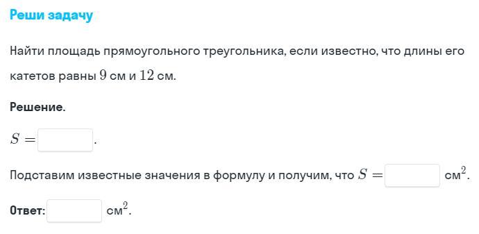 S = 1/2 * a * b = 1/2 * 9 * 12 = 54 см2