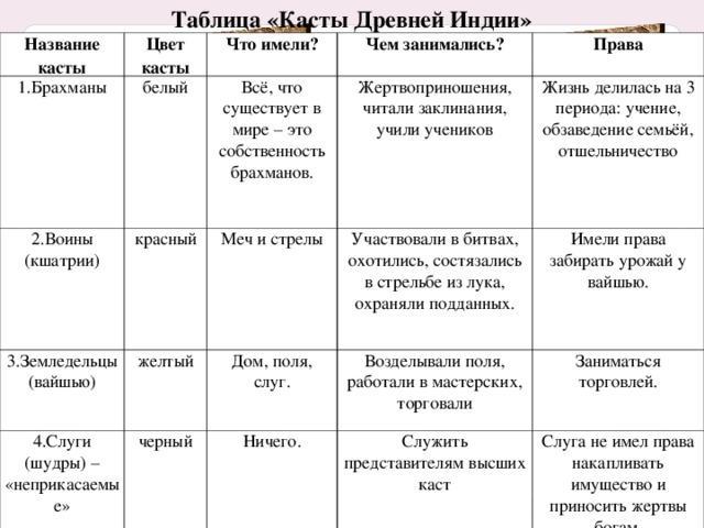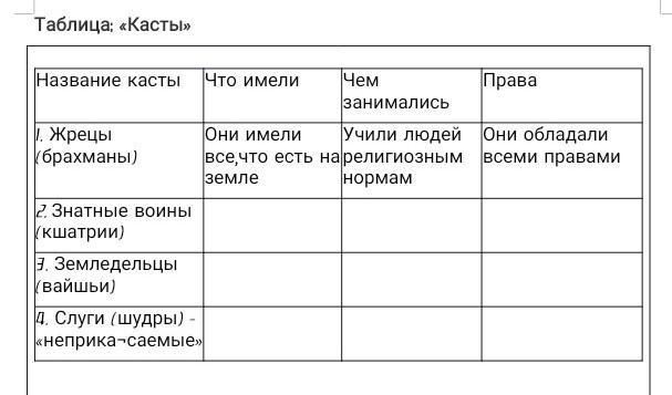 Таблица «Касть Название касты то имели Чем занимались Права 1. Жрець брахманы) Они имели Учили людей они обладали все, что есть на религиозным семи правами земле нормам Знатные войны (кшатрии) В. Земледельцы (вайшьи) а Слуги (шудры) - «неприкасаемые