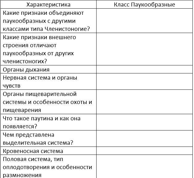 Биология 7 класс. Паукообразные. Помогите с таблицей. Прикреплена ниже. Даю 40 баллов!!!!!!