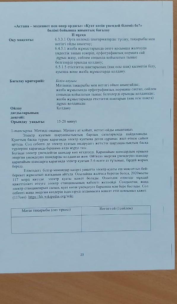 1-тапсырма. Мәтінді оқыңыз. Мәтінге ат қойып, негізгі ойды анықтаңыз. Электр қуатын шаруашылықтың барлық салаларында пайдаланады. Қуаттың басқа түріне қарағанда электр қуатына деген сұраныс жыл өткен сайын артуда. Сол себепті де электр қуатын өндірудегі жетістік шаруашылықтың басқа түрлеріне қарағанда біршама алда жүруі тиіс. Бүгінде электр үнемдейтін шамдар көп кездеседі. Қарапайым шамдардың орнына энергия үнемдеуші шамдарды қолданған жөн. Ойткені энергия үнемдеуші шамдар карапайым шамдарға қарағанда электр қуатын 5-6 есеге аз тұтынып, бірдей жарык береді. Еліміздегі білгір мамандар казіргі уақытта электр қуаты еш мақсатсыз бей- берекет жұмсалып жатқанын айтуда. Осылайша жалғаса беретін болса, 2020 жылы 117 млрд кВт/сағ. электр қуаты қажет болады. Өзіміздің елімізде мұндай қажеттілікті өтеуге электр станциясының қабілеті жетпейді. Сондықтан, жаңа электр станцияларын салып, қуат көзін үнемдеуге барынша мән бере бастады. Сол себепті жаңа энергия көздерін іздестіруді алдымызға мақсат етіп қоюымыз қажет.