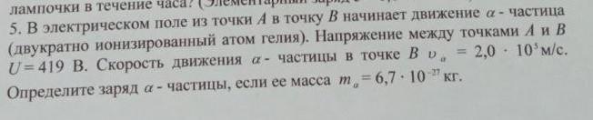 В электрическом поле из точки A в точку B начинает движение a-частица (двукратно ионизированный атом гелия). Напряжение между точками A и B это U=419 В. Скорость движения a-частицы в точке B это V=2,0*10^5 метров в секунду. Определите заряд a-частицы, если её масса это m=6,7*10^-27 килограмм.