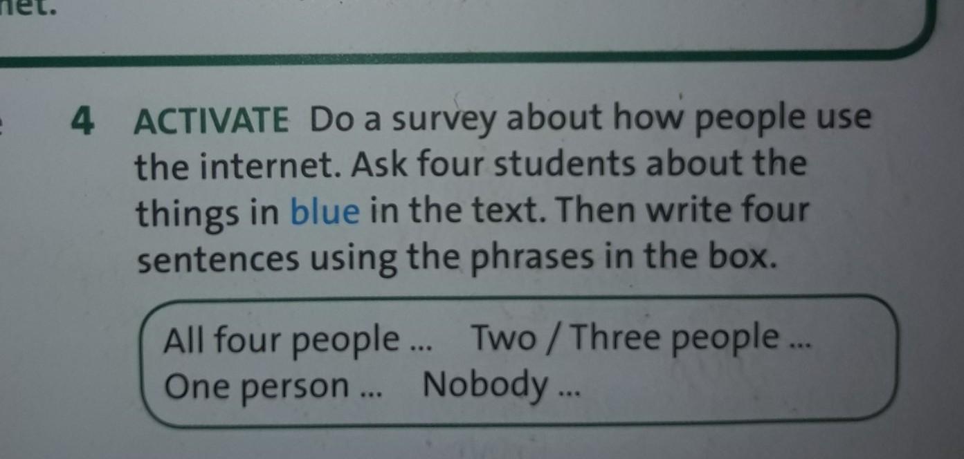 4 ACTIVATE Do a survey about how people use the internet. Ask four students about the things in blue in the text. Then write four sentences using the phrases in the box All four people ... Two / Three people ... One person ... Nobody