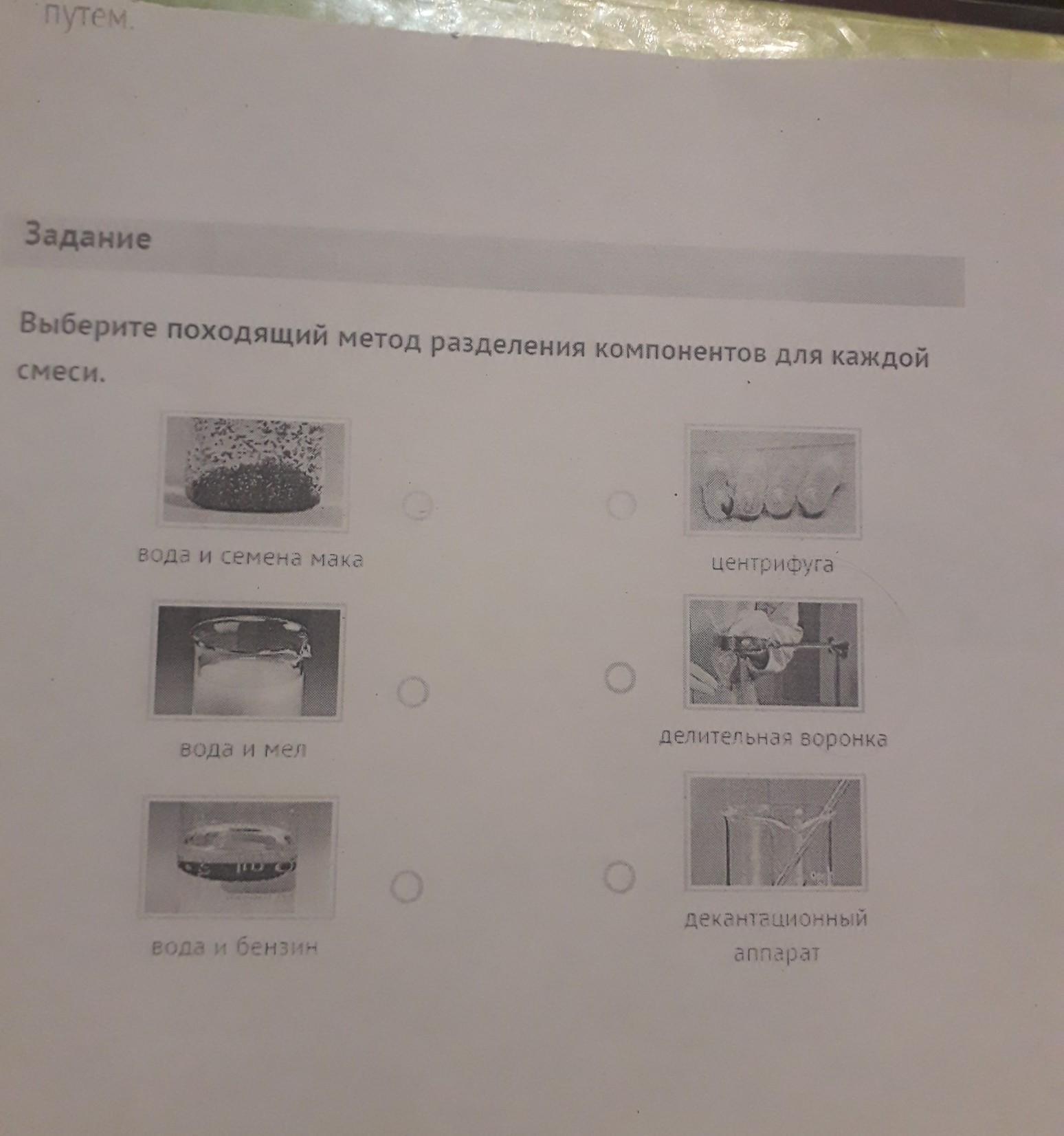 Задание Выберите походящий метод разделения компонентов для каждой смеси. вода и семена мама центрифуга делительная воронка вода имел вода и бензин декантационный аппарат