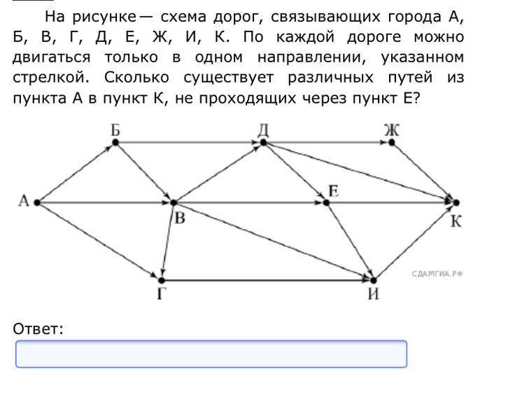 Срочно!!!! На рисунке — схема дорог, связывающих города А, Б, В, Г, Д, Е, Ж, И, К. По каждой дороге можно двигаться только в одном направлении, указанном стрелкой. Сколько существует различных путей из пункта А в пункт К, не проходящих через пункт Е?