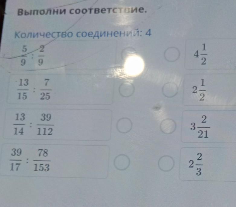 ВЫПОЛНИ соответствие. Количество со нений: 4 5 2 4 9 9 Nit Nin 13 7 — 15 2 25 13 39 : 14 112 2 3 21 39 78 : 17 153 تامین 2