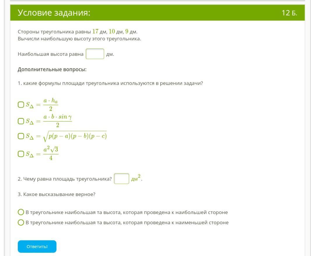 1. какие формулы площади треугольника используются в решении задачи?