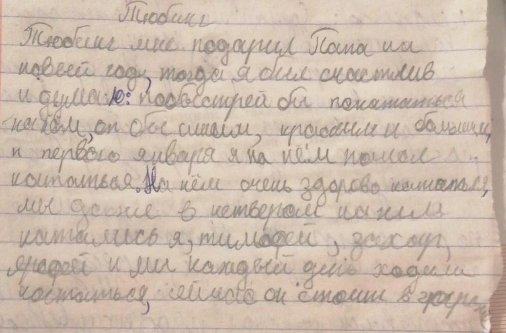 Тюбинг мне подарил папа. на Новый год тогда я был счастлив и думаю Побыстрее бы прокатиться на нем. он был синим красным и большим! и 1 января я на нём пошёл кататься .на нём очень здорово кататься! Мы даже четырём на нём катались. я ,Тимофей, Захар, фей и мы каждый день ходили кататься .сейчас он стоит в гараже.