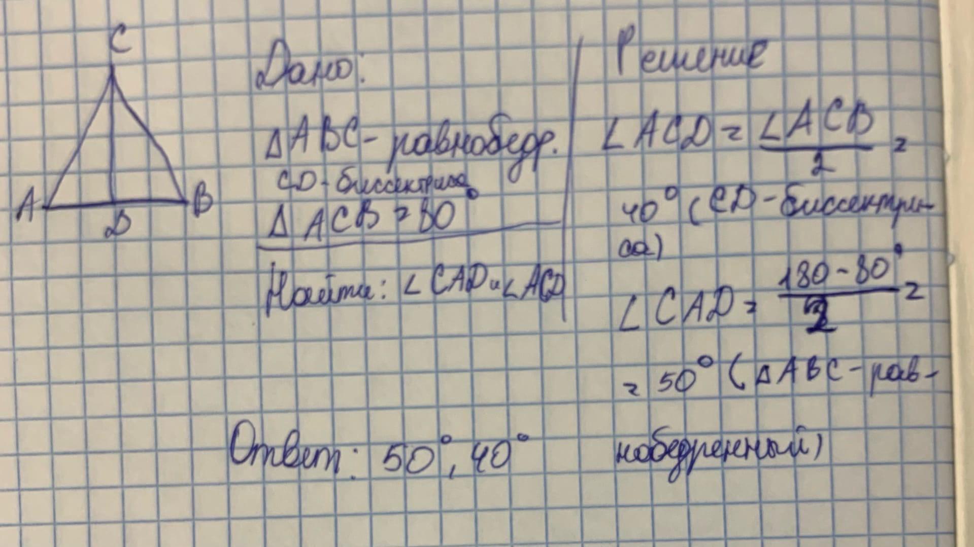 Срочно! В равнобедренном треугольнике АВС с основанием АВ проведина бисектриса СD. Определите угды САD и ACD, если угол АСВ=80 градусов