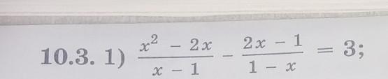 \displaystyle \frac{x^2-2x}{x-1}-\frac{2x-1}{1-x}=3,x\neq 1\\\\ \frac{x^2-2x}{x-1}-\frac{2x-1}{-(x-1)}=3\\\\ \frac{x^2-2x}{x-1}+\frac{2x-1}{x-1}=3\\\\ \frac{x^2-2x+2x-1}{x-1}=3\\\\ \frac{(x-1)(x+1)}{x-1}=3\\\\ x+1=3\\x=3-1\\x=2