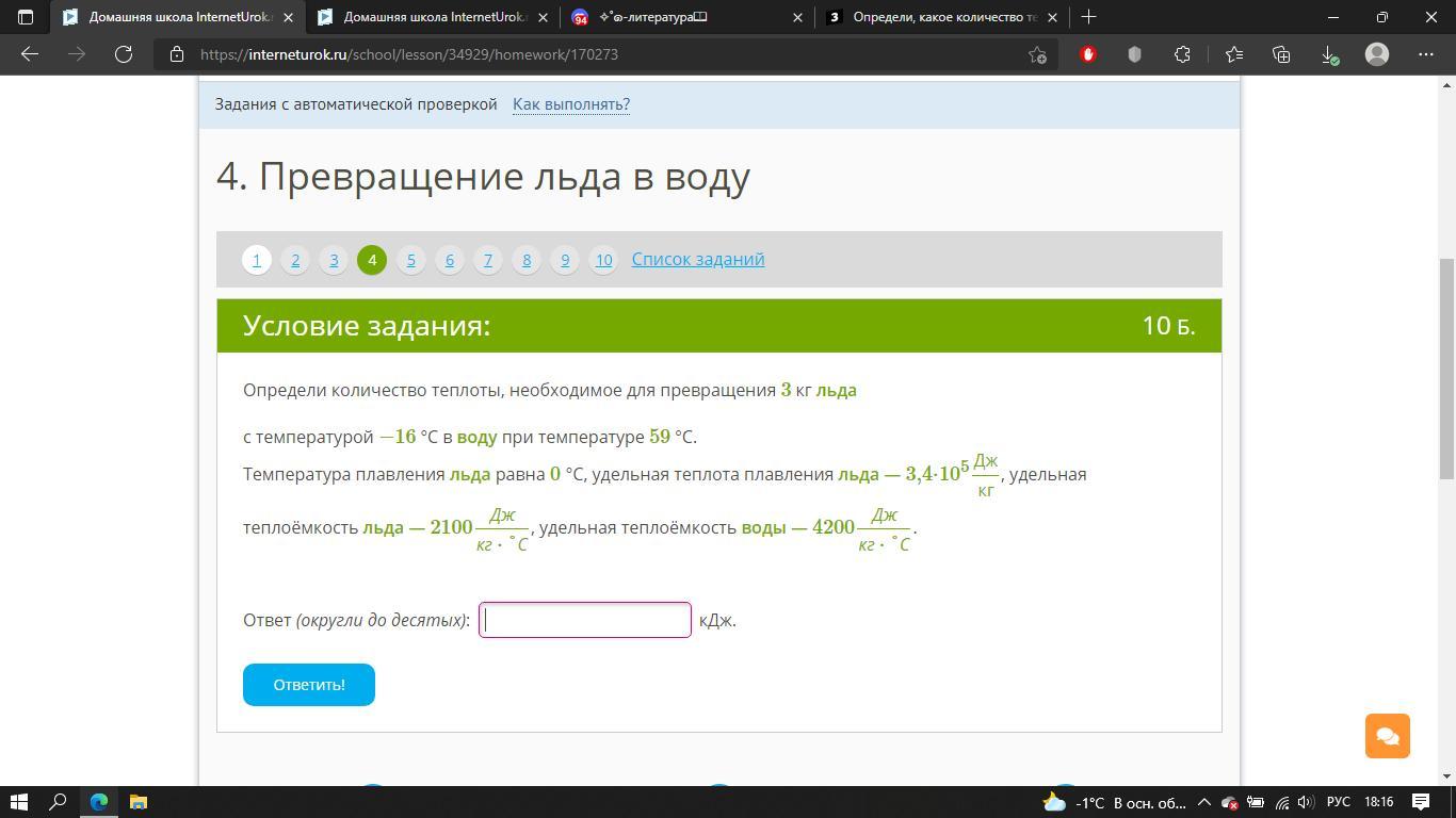 Температура плавления льда равна 0 °С, удельная теплота плавления льда — 3,4⋅105Джкг, удельная теплоёмкость льда — 2100Джкг⋅°С, удельная теплоёмкость воды — 4200Джкг⋅°С.