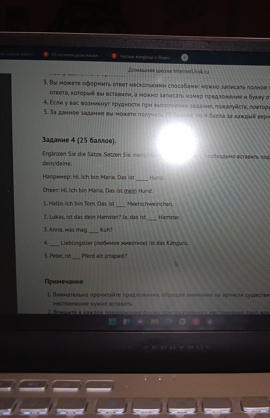 Задание 4 (25 баллов). Ergänzen Sie die Sätze. Setzen Sie mein/meine, dein/deine ein. Heo@xoAMMO BCTABUTb nogxongwee MECTOUMEHMe mein/meine, dein/deine. Hanpumep: Hi. Ich bin Maria. Das ist Hund. Otbet: Hi. Ich bin Maria. Das ist mein Hund. 1. Hallo. Ich bin Tom. Das ist Meerschweinchen. 2. Lukas, ist das dein Hamster? Ja, das ist Hamster 3. Anna, was mag — Kuh? 4. Lieblingstier (1110OUMOE KUBOTHOE) ist das Känguru. 5. Peter, ist_Pferd alt (ctapaa)?