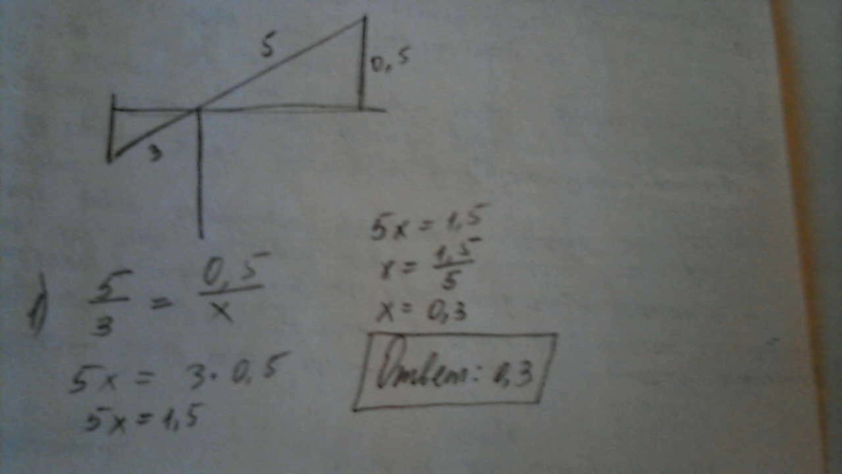 Короткое плечо колодца с журавлем имеет длину 3 м , а длинное плечо - 5 м. На сколько метров поднимется конец короткого плеча когда конец длинного опустится на 0,5 м?