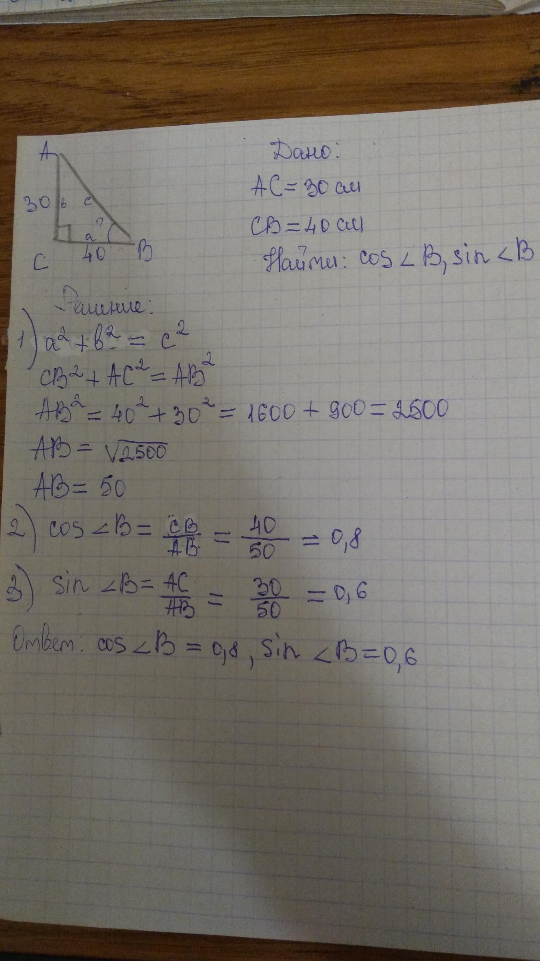в прямоугольном треугольнике abc угол c прямой, катеты равны 30 см и 40 см. найдите косинус и синус угла B