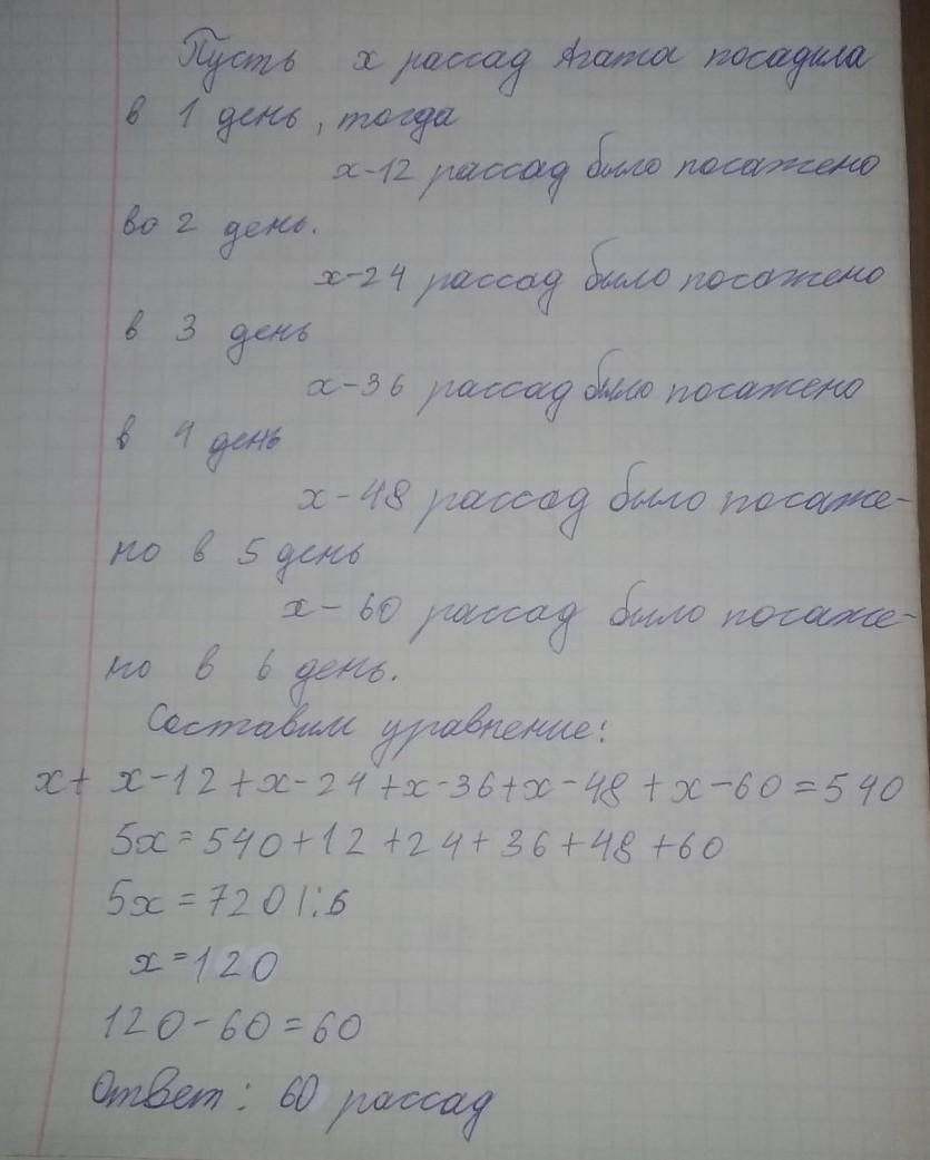 14. Агата сажала рассаду 6 дней. Каждый день она сажала на 12 растений меньше, чем в предыдущий день. Сколько растений Агата посадила в