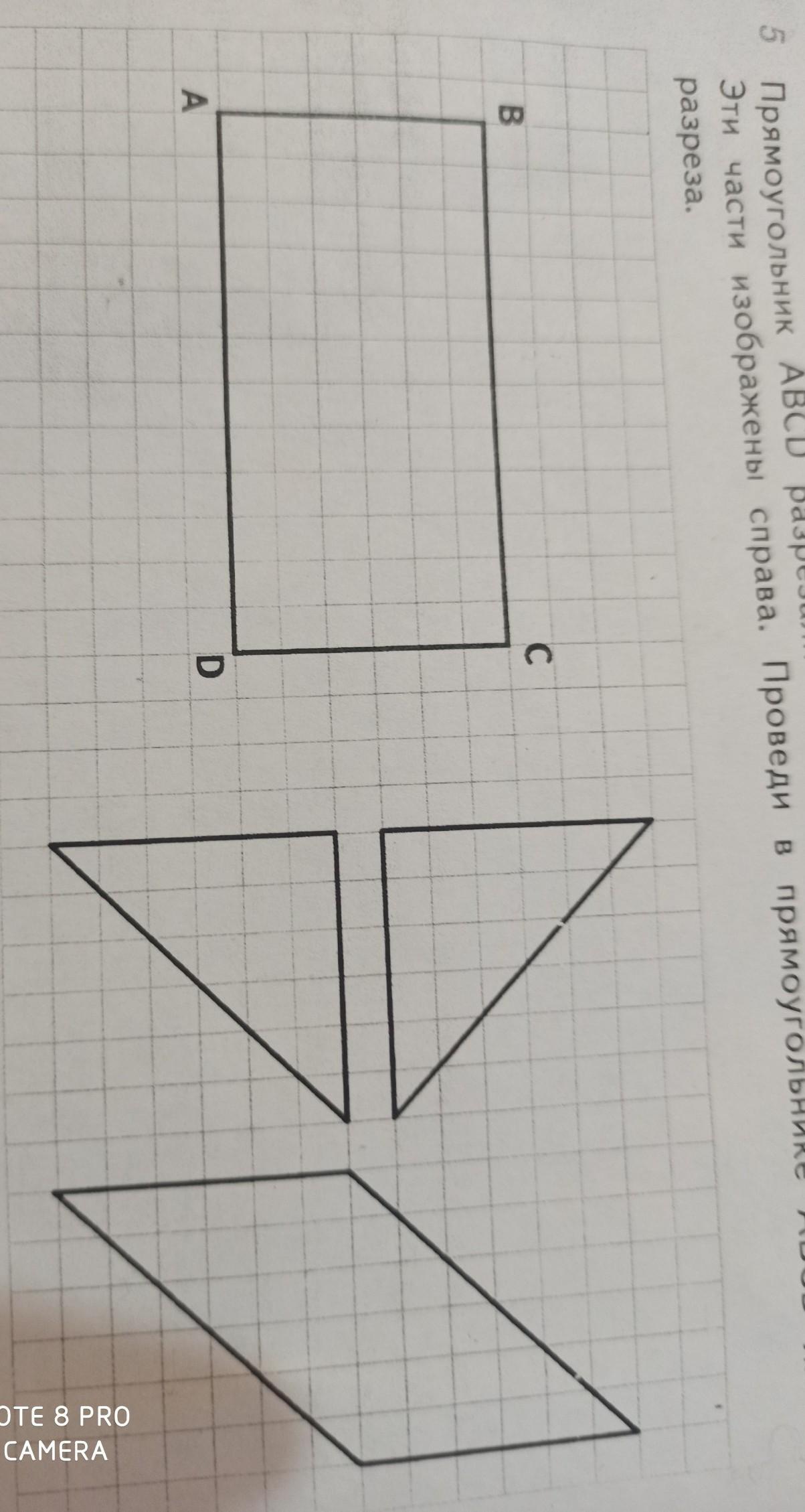 5 Прямоугольник ABCD разрезали на 2 треугольника и четырёхугольник. Зи части изображену справа. Проведи в прямоугольнике ABCD линии разреза С В D A