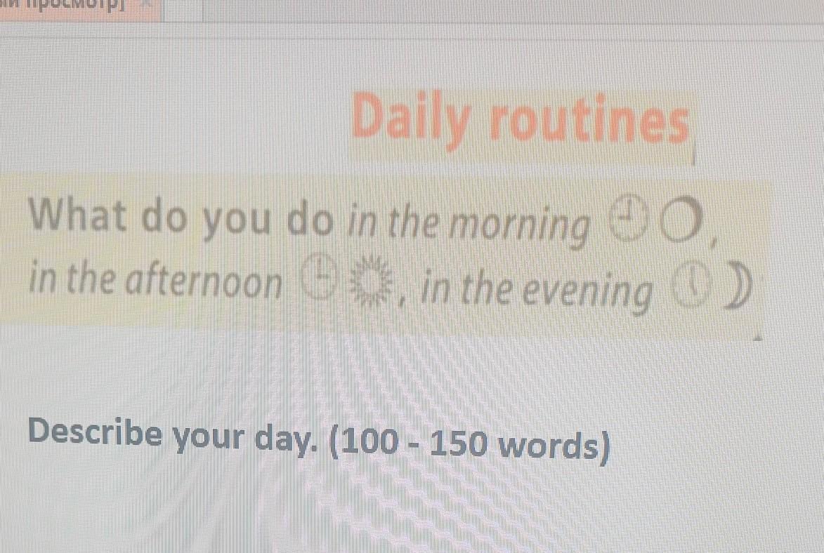 I want to tell you about my daily routine. In the morning after I wake up, I exercise, I wash my face, I brush my teeth and I have breakfast. I go to school, I am there from 8:30 to (… напиши до скольки ты в школе, например: 13:40). When I come home from school, I rest, feed my cat, read a book, help my mom around the house, do my homework, and then I go out with my friends. When I come out of the street, I wash my hands and go to dinner with my family. After dinner, I wash my face, brush my teeth, pack my things for tomorrow and go to bed.