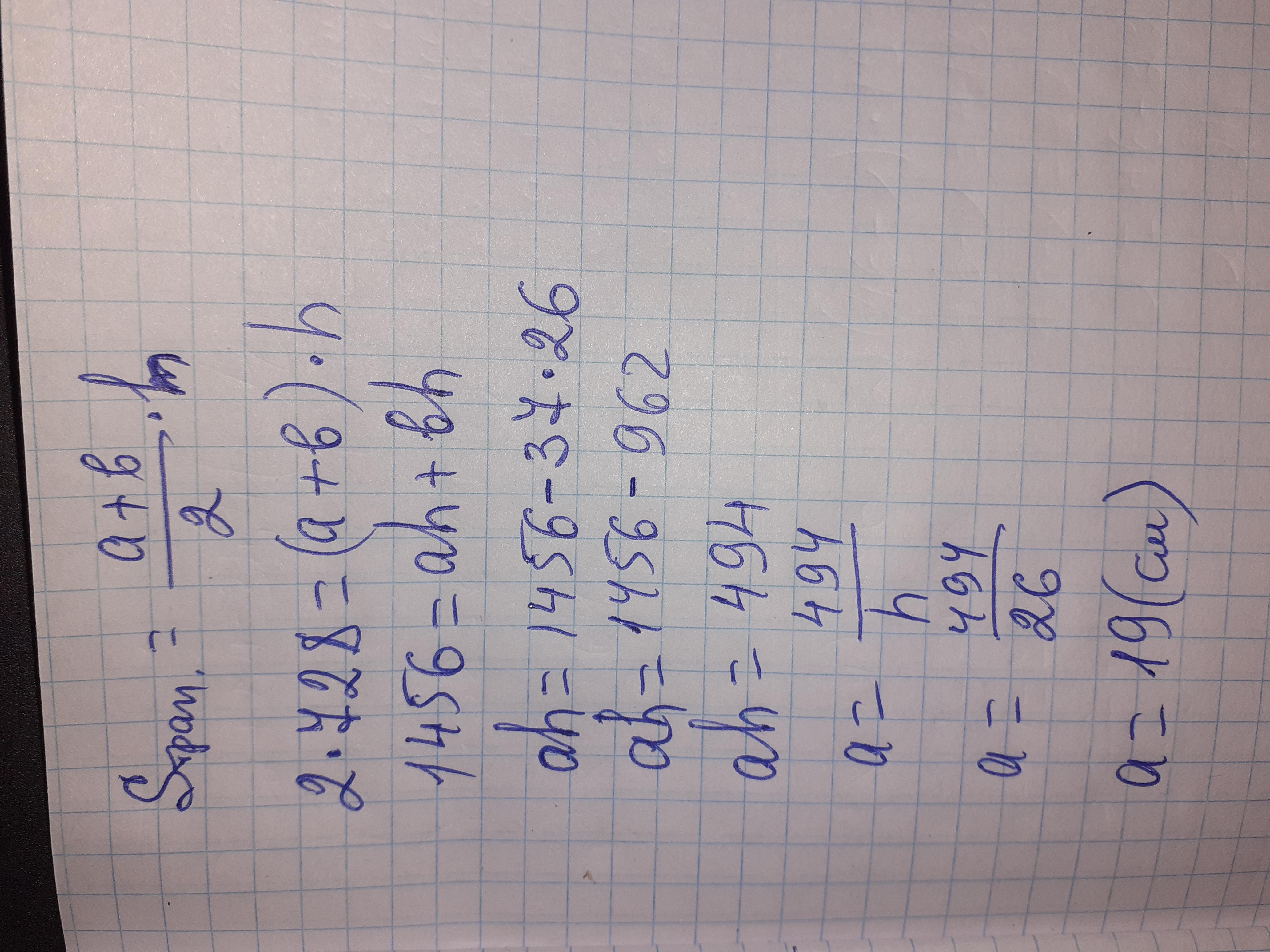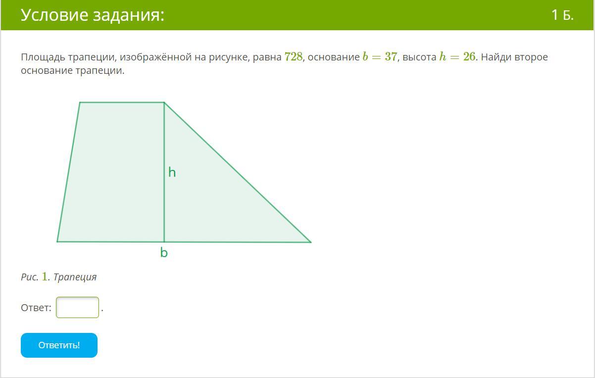 Площадь трапеции, изображённой на рисунке, равна 728, основание b=37, высота h=26. Найди второе основание трапеции.