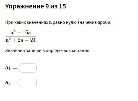 \dfrac{a^3-16a}{a^2+2a-24}=\dfrac{a(a-4)(a+4)}{(a+6)(a-4)}=\dfrac{a(a+4)}{a+6}\ \ \ \Rightarrow \\\\\\\left\{\begin{array}{l}a(a+4)=0\\a\ne 4\ ,\ a\ne -6\end{array}\right\ \ \ \Rightarrow \ \ \ \boxed{\ a_1=0\ ,\ a_2=-4\ }